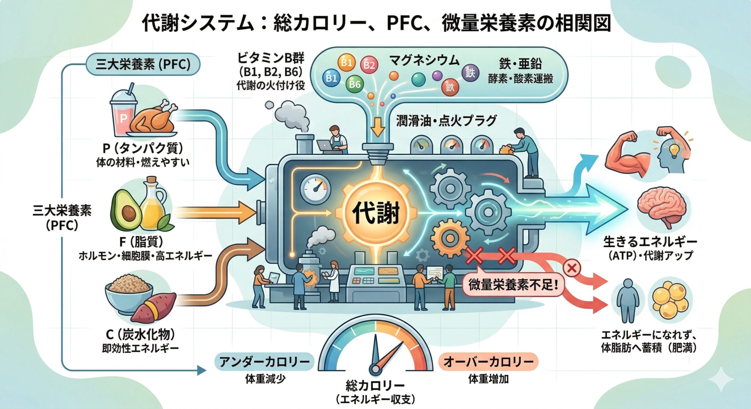 - ビタミン・ミネラル: 代謝という化学反応を停滞させないための「点火プラグ」。